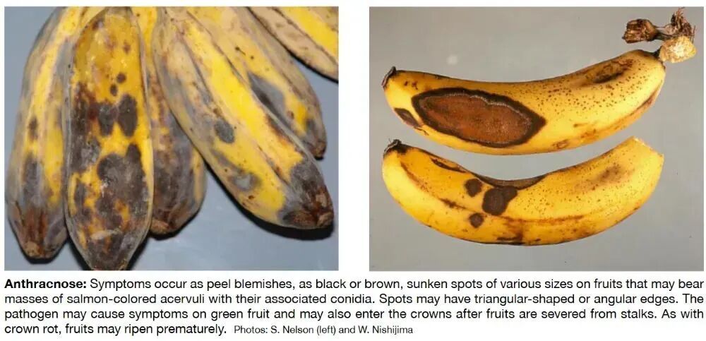 香蕉在采后贮运过程中可能会受到微生物病害,导致香蕉生病,比如香蕉炭疽病、黑星病、冠腐病和蕉腐病等[1、5],某些病菌感染会导致香蕉长出黑斑,其中最常见的就是香蕉炭疽病。这类香蕉的果肉很可能已经被霉菌污染,建议不要食用。
